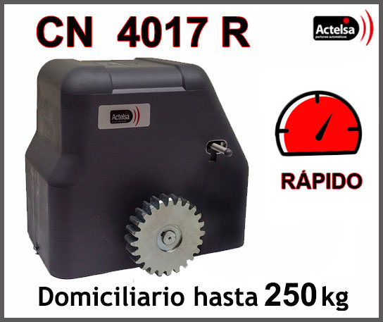 El corredizo Actelsa CN 4017 R para 250 kg tiene un motorreductor electromecánico rápido de 220V con una velocidad de 26 metros/minuto, (3metros / 7segundos). Está construido con metales nobles como el acero y aluminio, montados sus ejes sobre rulemanes de primera calidad.